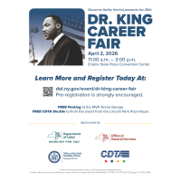 2026 Dr. King Career FairApril 2, 2026  ·  11 a.m. to 3 p.m.Empire State Plaza Convention Center279 Madison AveAlbany, NY 12242FREE Parking: MVP Parking Garage.FREE CDTA Shuttle: From Lincoln Park Pool House.NYS Department of Labor is hosting the Dr. King Career Fair at the Empire State Plaza Convention Center in Albany, NY on Thursday, April 2, 2026. In upholding the legacy of Dr. King, we are committed to keep moving forward and helping serve New Yorkers. With that in mind, the New York State ...read more